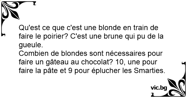 Combien de blondes sont nécessaires pour faire un gâteau au chocolat? 10, une pour faire la pâte et 9 pour éplucher les Smarties.