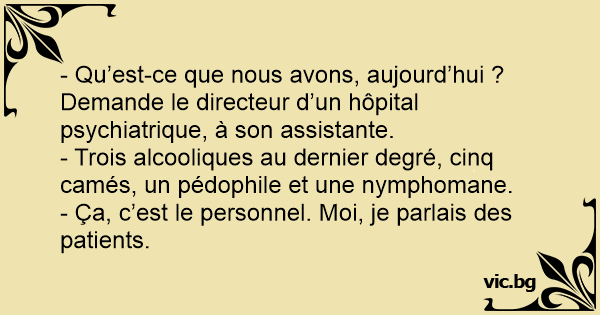 - Qu’est-ce que nous avons, aujourd’hui ? Demande le directeur d’un hôpital psychiatrique, à son assistante.