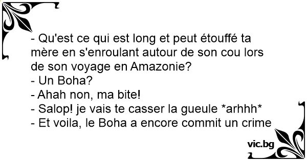 - Qu'est ce qui est long et peut étouffé ta mère en s'enroulant autour de son cou lors de son voyage en Amazonie?