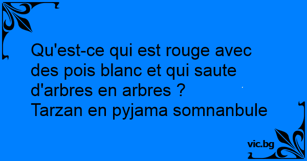 Qu'est-ce qui est rouge avec des pois blanc et qui saute d'arbres en arbres ? Tarzan en pyjama somnanbule