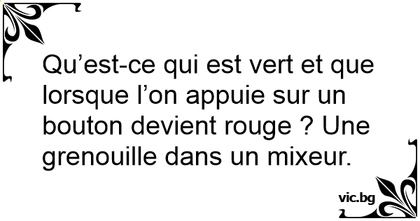 Qu’est-ce qui est vert et que lorsque l’on appuie sur un bouton devient rouge ? Une grenouille dans un mixeur.