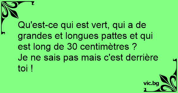 Qu'est-ce qui est vert, qui a de grandes et longues pattes et qui est long de 30 centimètres ?