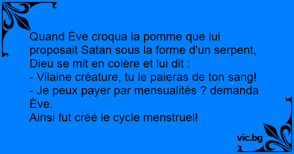 Quand Ève croqua la pomme que lui proposait Sатаn sous la forme d'un serpent, Dieu se mit en colère et lui dit :