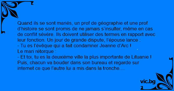 Quand ils se sont mariés, un prof de géographie et une prof d’histoire se sont promis de ne jamais s’insulter, même en cas de conflit sévère. Ils doivent utiliser des termes en rapport avec leur fonction. Un jour de grande dispute, l’épouse lance :