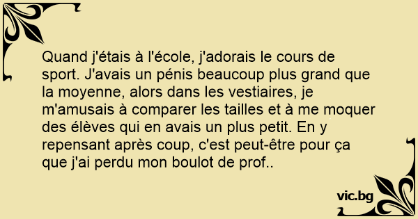 Quand j'étais à l'école, j'adorais le cours de sport. J'avais un pénis beaucoup plus grand que la moyenne, alors dans les vestiaires, je m'amusais à comparer les tailles et à me moquer des élèves qui en avais un plus petit. En y repensant après coup, c'est peut-être pour ça que j'ai perdu mon boulot de prof..