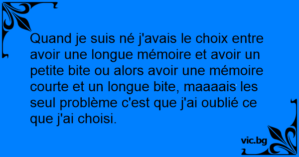 Quand je suis né j'avais le choix entre avoir une longue mémoire et avoir un petite bite ou alors avoir une mémoire courte et un longue bite, maaaais les seul problème c'est que j'ai oublié ce que j'ai choisi.