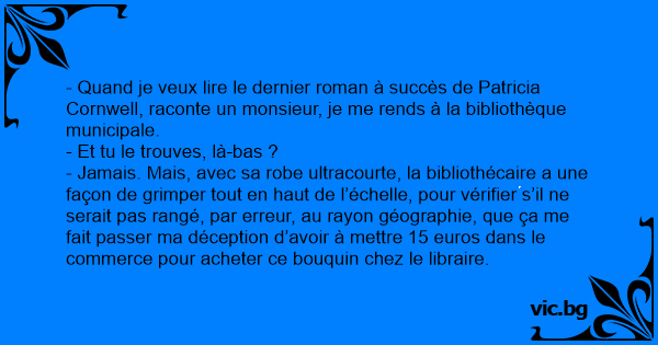 - Quand je veux lire le dernier roman à succès de Patricia Cornwell, raconte un monsieur, je me rends à la bibliothèque municipale.