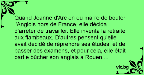 Quand Jeanne d'Arc en eu marre de bouter l'Anglois hors de France, elle décida d'arrêter de travailler. Elle inventa la retraite aux flambeaux. D'autres pensent qu'elle avait décidé de réprendre ses études, et de passer des examens, et pour cela, elle était partie bûcher son anglais a Rouen....