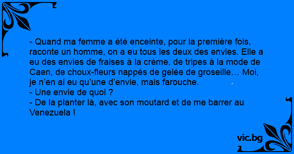 - Quand ma femme a été enceinte, pour la première fois, raconte un homme, on a eu tous les deux des envies. Elle a eu des envies de fraises à la crème, de tripes à la mode de Caen, de choux-fleurs nappés de gelée de groseille… Moi, je n’en ai eu qu’une d’envie, mais farouche.