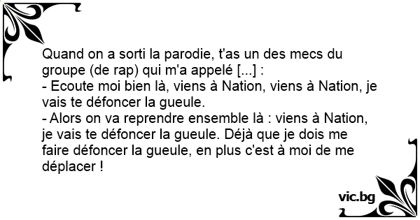 Quand on a sorti la parodie, t'as un des mecs du groupe (de rap) qui m'a appelé [...] :