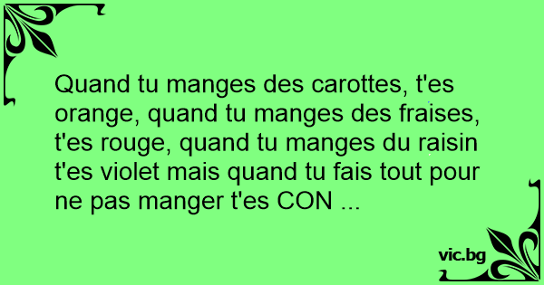 Quand tu manges des carottes, t'es orange, quand tu manges des fraises, t'es rouge, quand tu manges du raisin t'es violet mais quand tu fais tout pour ne pas manger t'es СОN ...