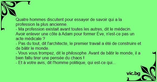 - Ma profession existait avant toutes les autres, dit le médecin. Avoir enlever une côte à Adam pour former Ève, n'est-ce pas un acte médicale ?