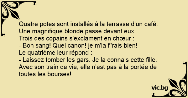 Quatre potes sont installés à la terrasse d'un café. Une magnifique blonde passe devant eux.