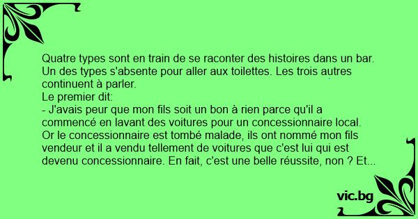 - J'avais peur que mon fils soit un bon à rien parce qu'il a commencé en lavant des voitures pour un concessionnaire local. Or le concessionnaire est tombé malade, ils ont nommé mon fils vendeur et il a vendu tellement de voitures que c'est lui qui est devenu concessionnaire. En fait, c'est une belle réussite, non ? Et il vient tout juste d'offrir à son meilleur ami une Mercedes pour son anniversaire.