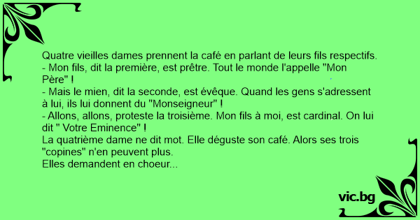 - Allons, allons, proteste la troisième. Mon fils à moi, est cardinal. On lui dit " Votre Eminence" !