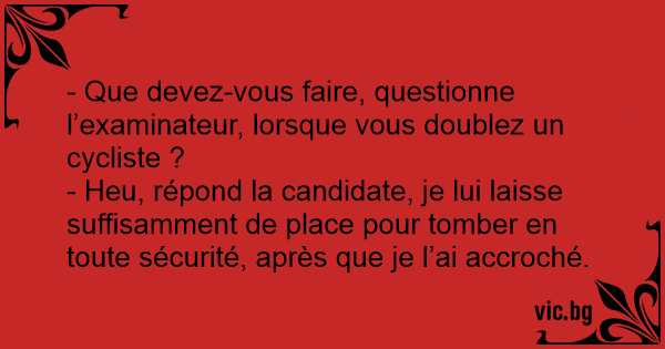 - Que devez-vous faire, questionne l’examinateur, lorsque vous doublez un cycliste ?