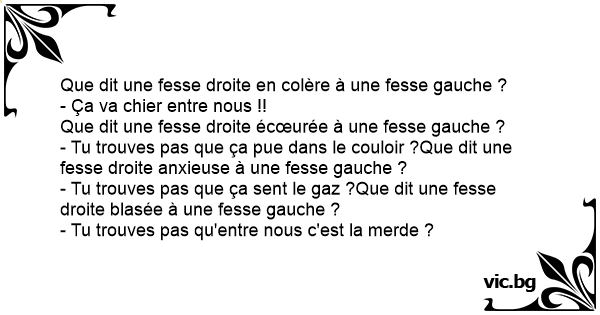 - Tu trouves pas que ça pue dans le couloir ?Que dit une fesse droite anxieuse à une fesse gauche ?