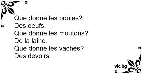 La prof demande à ses élèves: - Que produit la poule ? Les élèves disent: - Des œufs - Que produit le cochon ? - Des saucisses - Que produit la vache ? - Des devoirs.