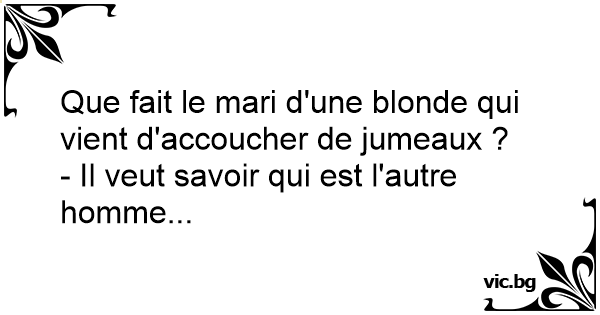Blondīnei piedzimst dvīņi. Viņa sēž un rūgti raud. Pienāk medmāsa un prasa: Kādēļ Jūs raudat? Ko es teikšu vīram, no kā man ir otrs bērns?