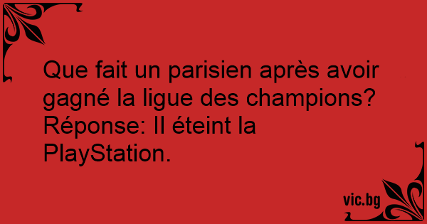 Τι έκανε ο ολυμπιακός Was machen die Deutschen, wenn sie Fußball-Europameister geworden sind? - Die Playstation aus und ins Bett gehen. ¿Qué hace un hincha del Real Madrid luego de ganar la Champions League? -Apagar su PlayStation! Co zrobi kibic, gdy Polacy wygrają Euro 2012? - Wyłączy konsolę i pójdzie spać. Was macht ein Holländer, nachdem sein Land die Fußballweltmeisterschaft gewonnen hat? Er macht die PlayStation aus und geht ins Bett! Wat Belgen direct doen als ze het WK zouden winnen? Playstation afsluiten en gaan slapen. Hvad gør man når Brøndby vinder Superligaen? - Slukker playstationen og går i seng Hvad gør man hvis AGF binder superligaen? -  Slukker for sin Playstation og vender tilbage til det virkelige liv! Wat doet een feyenoorder als hij de Chamions league heeft gewonnen..... Playstation uit en slapen Vad gör man när Häcken vinner allsvenskan? - Stänger av playstationet och går tillbaka till det riktiga livet.. Wat doet een duitser als hij het wk voetbal heeft gewonnen??? .................... .................... .................... Hij zet zijn playstation uit en gaat slapen Pffff kom je tekens te kort... - Mit csinál a magyar futball-válogatott, ha megnyerik a foci VB-t? - ??? - Kikapcsolják a Playstation-t. Hvad gør en FCK fan, når hans hold har vundet en kamp? Slukker sin Playstation og går i seng.. Qué hace mexico despues de ganar el mundial ??? R: pss apagar el play station jeje Frage: Was macht ein Fußball-Fan, nachdem Schalke Meister geworden ist? Antwort: Er macht die PlayStation wieder aus und geht ins Bett. Que fait un supporter de Nantes quand son équipe a remporté la Ligue 1 ? Éteint sa playstation. Que font les joueurs du Nantes quand ils ont gagné un match ? - Ils éteignent la Playstation! Co zrobi Polak gdy Polska wygra mistrzostwa świata w piłce nożnej w Katarze? - Wyłączy playstation i pójdzie spać. Que fait un joueur de l’équipe de France de football après avoir gagné un match? Il éteint sa Playstation. - Mit ér el a magyar válogatott a világbajnokságon? - A következő hazatartó repülőgépet. - Mikor nyeri meg a magyar válogatott az Eb-t? - Ha bekapcsolja a PlayStationt. - Ką veikia lietuviai laimėję Pasaulio futbolo čempionatą? - Išjungia savo Playstation… Klausimas: Ką daro Antanas Sireika kai jo vadovaujamas Žalgiris laimi Eurolygą? Atsakymas: Išjungia PlayStation ir eina miegoti. Klausimas: Ką daro Lietuvos krepšinio rinktinės fanas, kai Vidas Ginevicius neprasižengia per rungtynes? Atsakymas: Išjungia Playstation ir eina miegot.