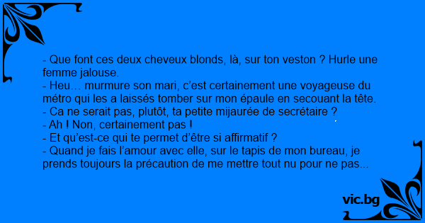 - Que font ces deux cheveux blonds, là, sur ton veston ? Hurle une femme jalouse.