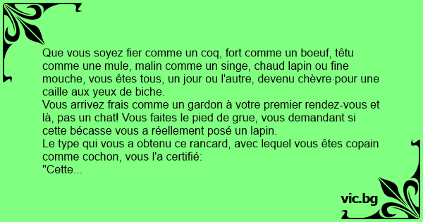 Que vous soyez fier comme un coq, fort comme un boeuf, têtu comme une mule, malin comme un singe, chaud lapin ou fine mouche, vous êtes tous, un jour ou l'autre, devenu chèvre pour une caille aux yeux de biche.