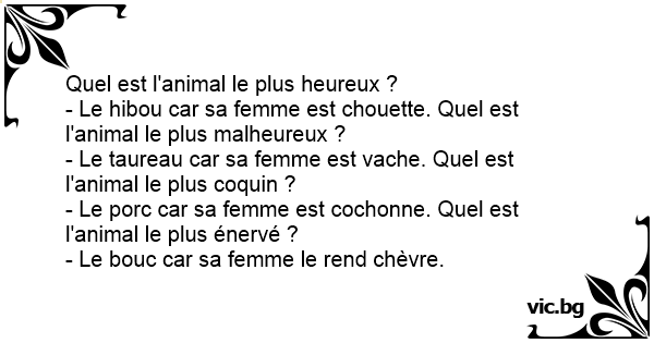 - Le hibou car sa femme est chouette. Quel est l'animal le plus malheureux ?