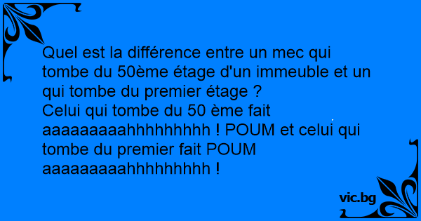 Quelle est la différence entre tomber du 1er ou du 10ème étage ? Каква е разликата да паднеш от 8-мия и 1-вия етаж. От 8-мия етаж се чува: - Vet du hva som er forskjell mellom å falle fra 13. etasje og 1. etasje? - Nei! Svar: Et fall fra 13. etasje høres slik ut: Uææææææh! Bom! Mens et fall fra 1. etasje hørest slik ut: Bom! Uææææææh!