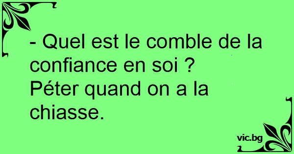 - Quel est le comble de la confiance en soi ?Péter quand on a la chiasse. 11 0 0 Quel est le comble ? Blagues sur les combles