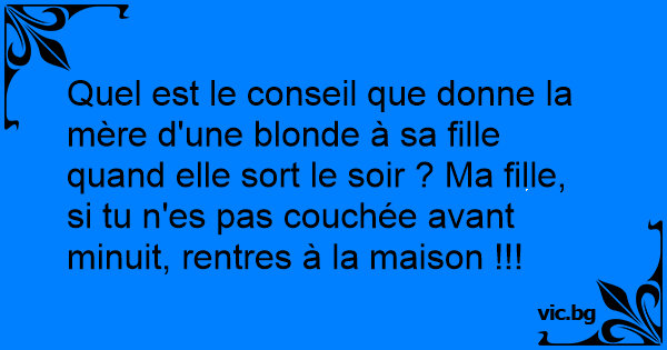 Quel est le conseil que donne la mère d'une blonde à sa fille quand elle sort le soir ? Ma fille, si tu n'es pas couchée avant minuit, rentres à la maison !!!