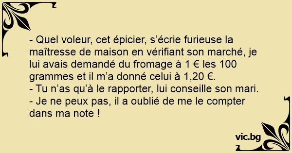 - Quel voleur, cet épicier, s’écrie furieuse la maîtresse de maison en vérifiant son marché, je lui avais demandé du fromage à 1 € les 100 grammes et il m’a donné celui à 1,20 €.