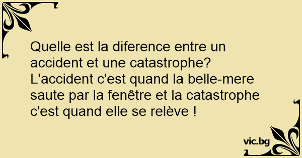 Quelle est la diference entre un accident et une catastrophe?<br />L'accident c'est quand la belle-mere saute par la fenêtre et la catastrophe c'est quand elle se relève !