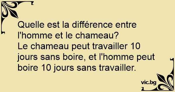 Un chameau peux travailler 10 jours sans boire Un homme dit : - « Moi, je peux boire 10 jours sans travailler »