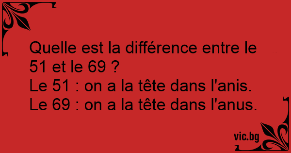 Quelle est la différence entre le 51 et le 69 ?<br />Le 51 : on a la tête dans l'anis.<br />Le 69 : on a la tête dans l'аnus.