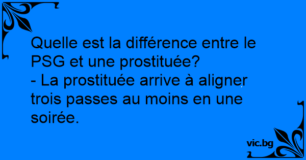Български English Deutsch Español Русский Quelle est la différence entre le PSG et une prostituée? - La prostituée arrive à aligner trois passes au moins en une soirée. Italiano Ελληνικά Македонски Türkçe Українська Português Polski Svenska Nederlands Dansk Norsk Suomi Magyar Româna Čeština Lietuvių Latviešu Hrvatski