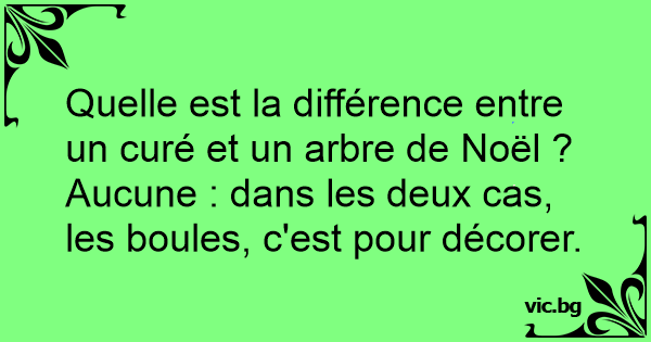Quelle est la différence entre un curé et un sapin de Noël ? Aucune: dans les deux cas les boules servent uniquement à décorer. ou bien Les boules du sapin servent au moins une fois dans l'année !