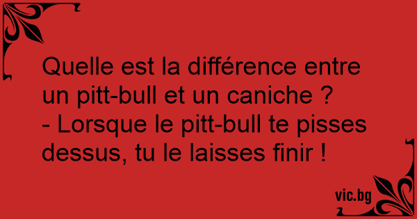 - Какая разница между ротвейлером и пуделем? - Каква е разликата между ротвайлер и пудел? - Quelle est la différence entre un pitt-bull qui fait ses besoins sur toi et un caniche qui fait ses besoins sur toi? - Le pitt-bull, tu le laisses finir!!! La blague du jour Quelle est la différence entre un caniche et un pitbull quand ils vous pissent sur la jambe ? Le pitt-bull, on attend sagement qu'il ait terminé.