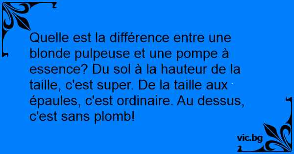 Quelle est la différence entre une blonde pulpeuse et une pompe à essence? Du sol à la hauteur de la taille, c'est super. De la taille aux épaules, c'est ordinaire. Au dessus, c'est sans plomb!