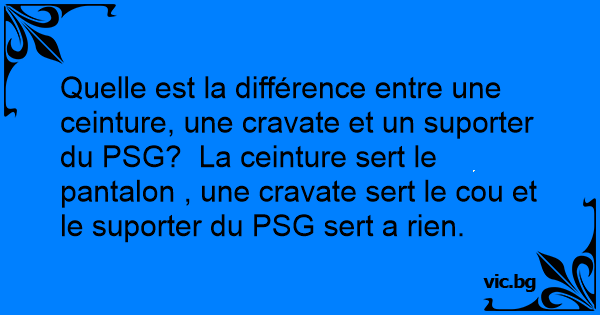 Quelle est la différence entre une ceinture, une cravate et un suporter du PSG? La ceinture sert le pantalon , une cravate sert le cou et le suporter du PSG sert a rien.