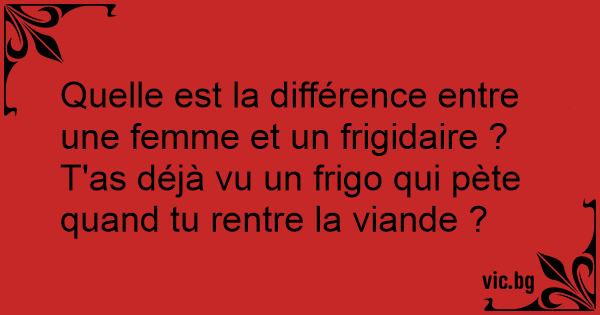 Quelle est la différence entre une femme et un frigidaire ? T'as déjà vu un frigo qui pète quand tu rentre la viande ?