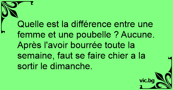 Quelle est la différence entre une femme et une poubelle ? Aucune. Après l'avoir bourrée toute la semaine, faut se faire chier a la sortir le dimanche.