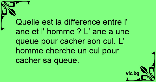 Quelle est la difference entre l' ane et l' homme ? L' ane a une queue pour cacher son cul. L' homme cherche un cul pour cacher sa queue.