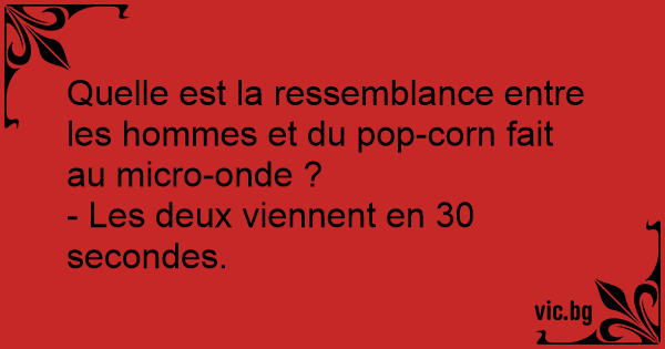 Quelle est la ressemblance entre les hommes et du pop-corn fait au micro-onde ? - Les deux viennent en 30 secondes.