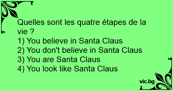 Quelles sont les quatre étapes de la vie ? 1) Vous croyez au Père-Noël 2) Vous ne croyez pas au Père-Noël 3) Vous êtes le Père-Noël 4) Vous ressemblez au Père-Noël