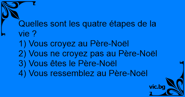Quelles sont les quatre étapes de la vie ? 1) You believe in Santa Claus 2) You don't believe in Santa Claus 3) You are Santa Claus 4) You look like Santa Claus