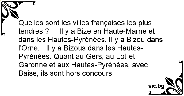 Quelles sont les villes françaises les plus tendres ? Il y a Bize en Haute-Marne et dans les Hautes-Pyrénées. Il y a Bizou dans l'Orne. Il y a Bizous dans les Hautes-Pyrénées. Quant au Gers, au Lot-et-Garonne et aux Hautes-Pyrénées, avec Baise, ils sont hors concours.