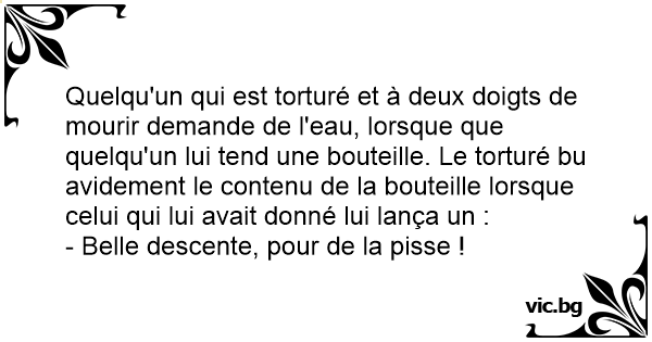 Quelqu'un qui est torturé et à deux doigts de mourir demande de l'eau, lorsque que quelqu'un lui tend une bouteille. Le torturé bu avidement le contenu de la bouteille lorsque celui qui lui avait donné lui lança un :