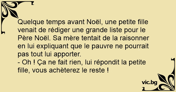Quelque temps avant Noël, une petite fille venait de rédiger une grande liste pour le Père Noël. Sa mère tentait de la raisonner en lui expliquant que le pauvre ne pourrait pas tout lui apporter.