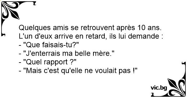 Quelques amis se retrouvent après 10 ans. L'un d'eux arrive en rетаrd, ils lui demande :