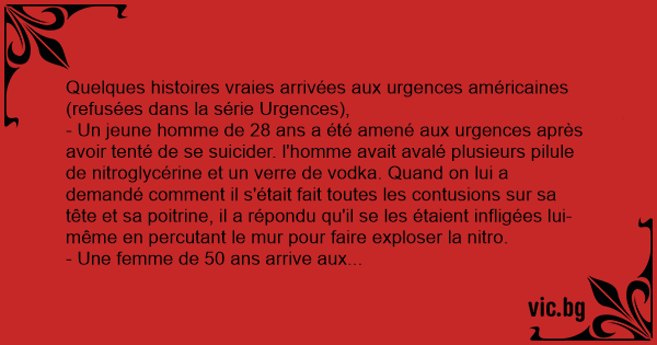- Un jeune homme de 28 ans a été amené aux urgences après avoir tenté de se suicider. l'homme avait avalé plusieurs pilule de nitroglycérine et un verre de vоdка. Quand on lui a demandé comment il s'était fait toutes les contusions sur sa tête et sa poitrine, il a répondu qu'il se les étaient infligées lui-même en percutant le mur pour faire exploser la nitro.